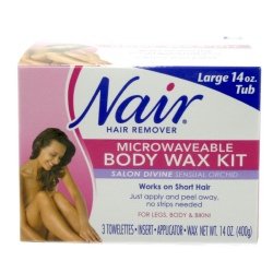 Nair Salon Divine Microwavable Body Wax kit is great for hair removal on the legs, arms, underarms, or bikini area. Microwavable wax is ready in 90 seconds. Sensual Orchid scent smells great, and wax removes easily without pesky strips to cut. Leaves skin smooth and radiant and lasts weeks longer than shaving. Includes 14 oz. wax tub, 1 applicator and three towlettes.